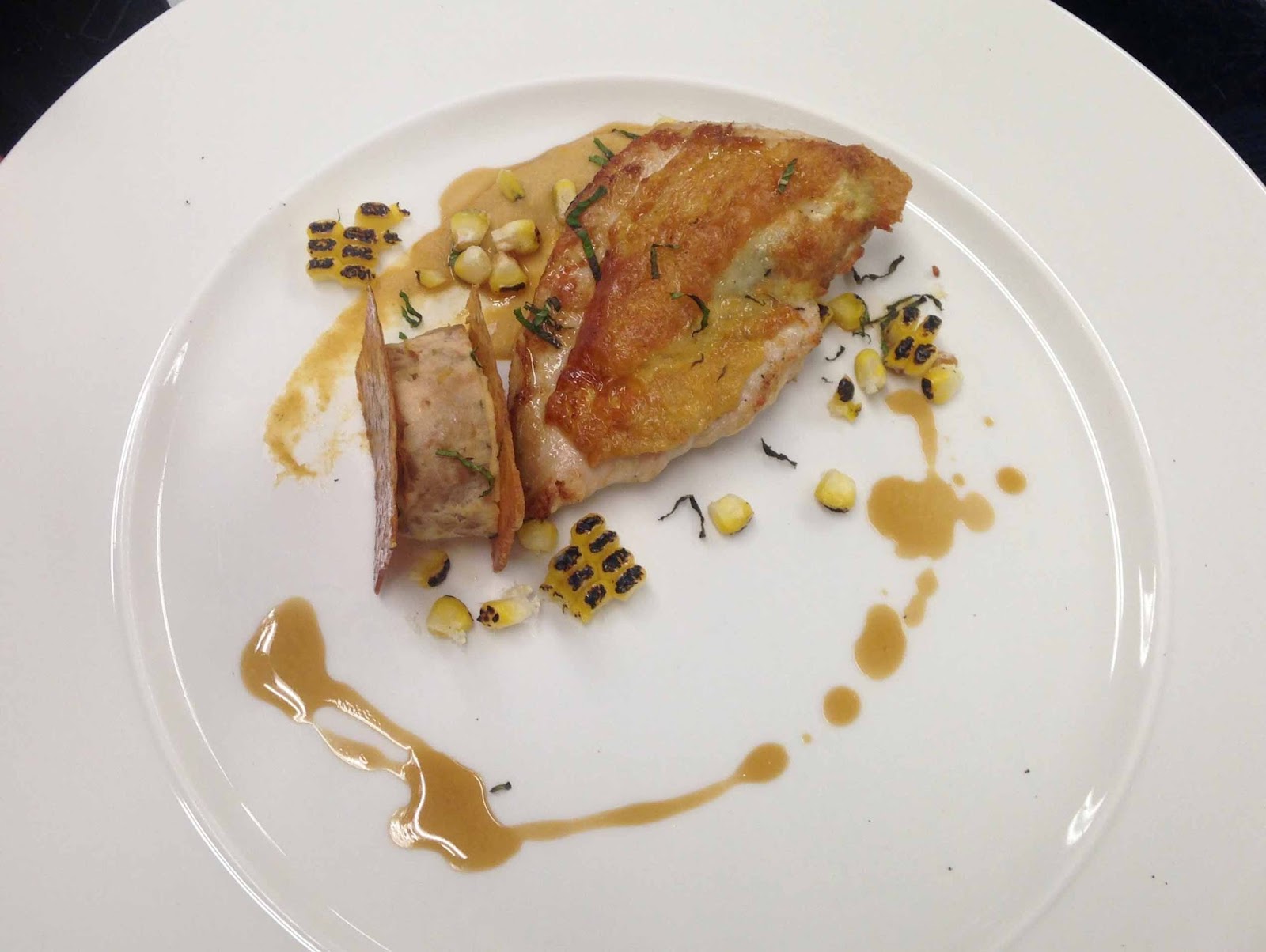 So guinea fowl- essentially a posh chicken. A fattier, richer, gamier tasting chicken. When you handle it it's ridiculous, your hands get so greasy. This is with a cumin-spiced fennel puree, some pretty-looking charred corn, a sandwich made with crispy guinea fowl skin and a guinea fowl leg sausage patty and some jus.